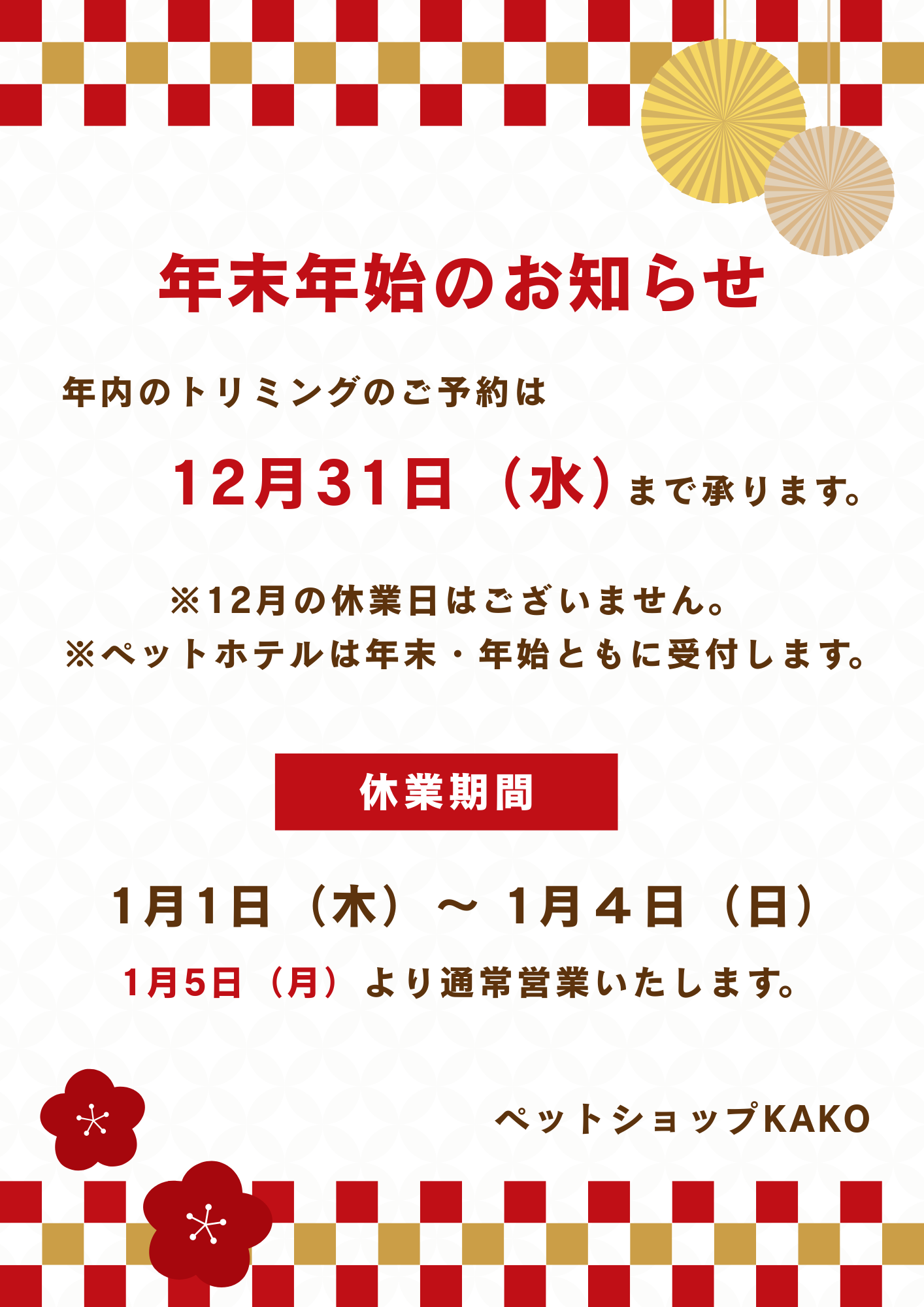 ペットショップKAKOは年内のトリミングのご予約を12月31日(水)まで承ります!