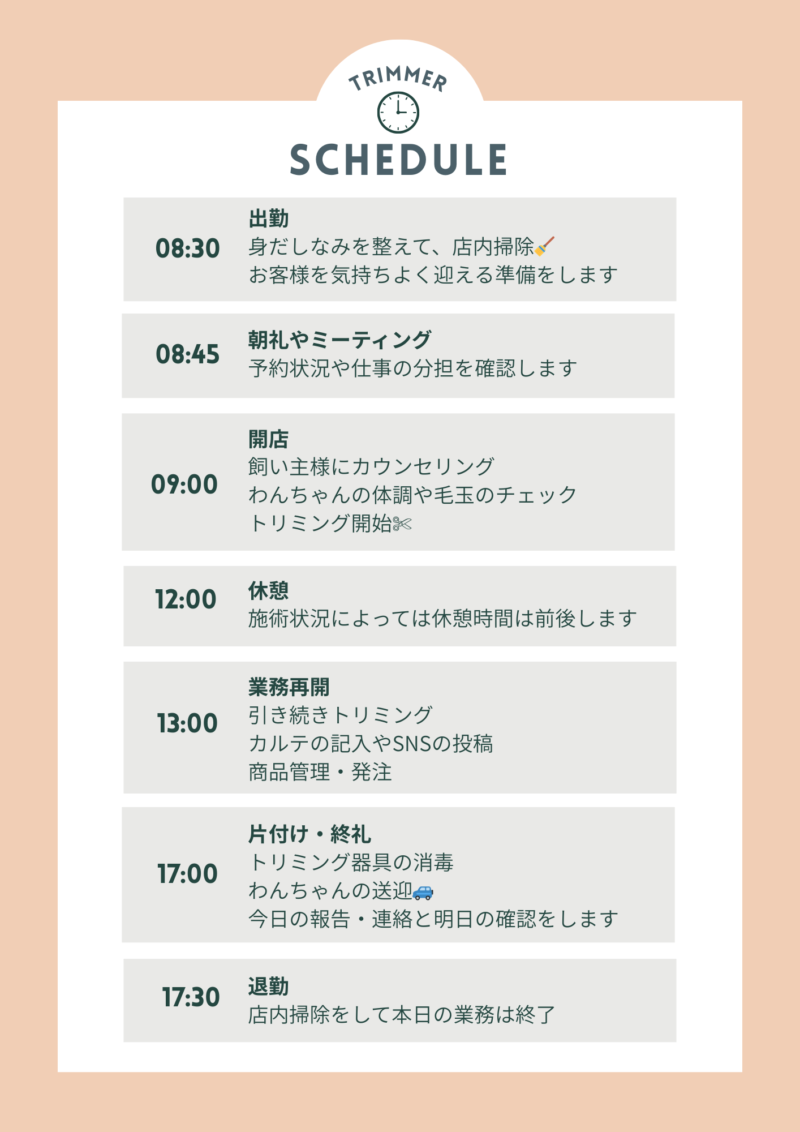 閉店作業: 店内の清掃やゴミまとめ、トリミング器具のお手入れ、レジ締めなど。