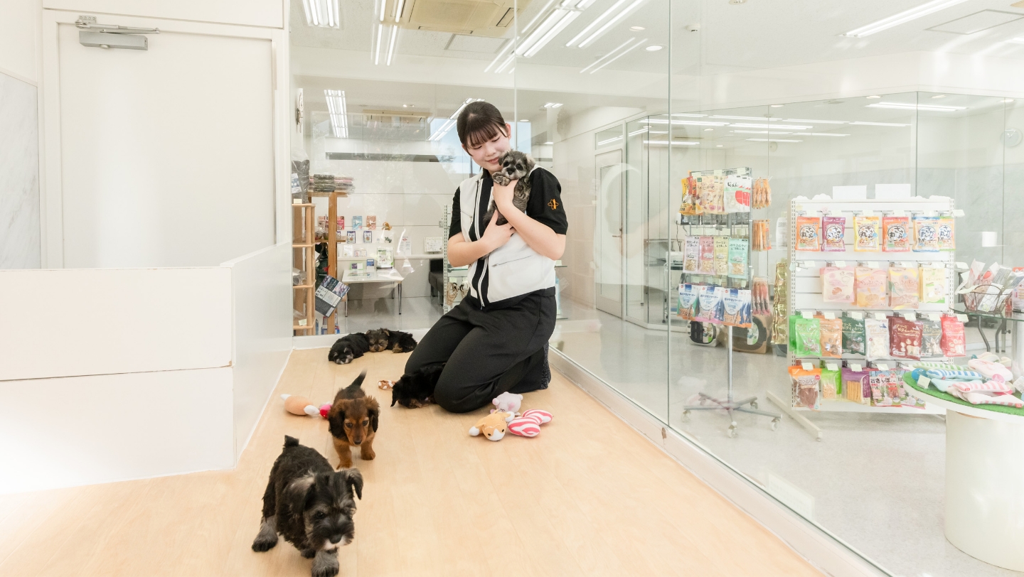 仔犬たちが元気に走り回るパピールームでふれあいながらお世話します。