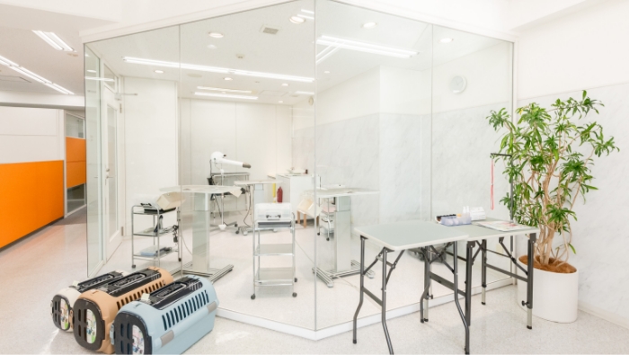 動物看護室は、保定実習・健康チェックなどの各種実習を1人1頭で行うための施設が整っています。