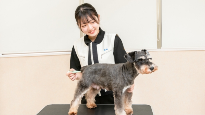 トリミング実習では、1年生のうちは校内のモデル犬で練習し、2年生になると本物のお客様の愛犬を担当します。