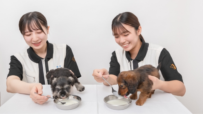 お母さん犬と子犬をお世話して成長をサポートします。いろいろな犬種を育てることが動物のプロになれるコツです。